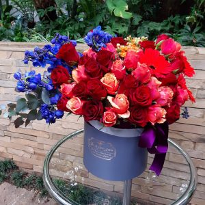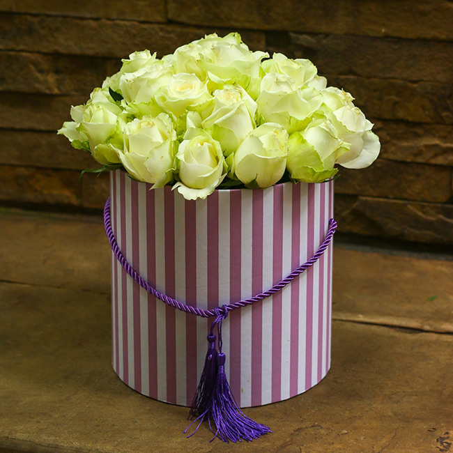 White roses in a striped hat box.