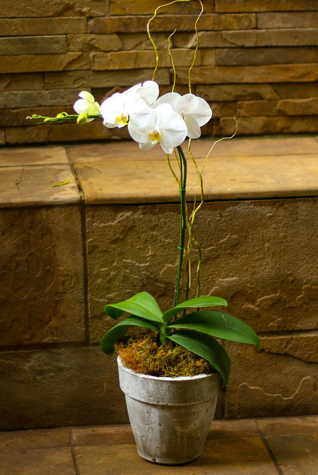 White orchid styled in a vase with moss. Please note that the vase may differ from the picture.